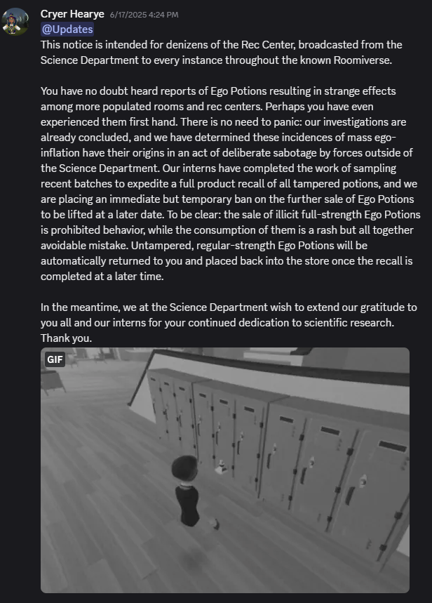 In June of this year I let a bug slip into production. Luckily, it was a pretty amusing one. Instead of halting the presses, I was approved to spin the issue into a LiveOps event with a bit of narrative framing. When our latest payload went live, an arrogant hacker made an announcement in Rec Room's official discord, alluding to a change in an item we sell that temporarily increases the size of your avatar's head. After some investigation, players discovered this hacker had modified our Ego Potions to affect everyone in the room when consumed. This was a fun narrative event and lowering the cost of these items as part of the spectacle showed us that we had priced these items too high for too long, while reaping maybe the greatest few days of revenue that item had ever seen. Just a fun bit of evasion, which then set the tone and served as a teaser for a then upcoming hacker themed event, called Glitch Grenades.