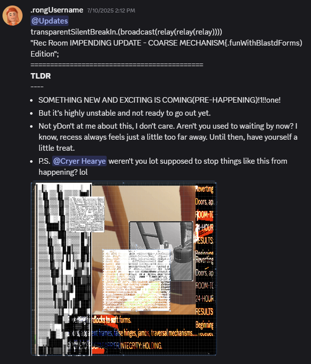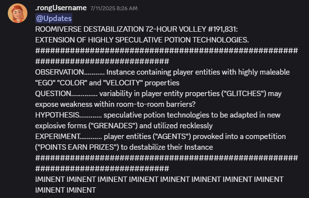 While working as QA for our first competitive leaderboard event, I was invited to continue using my writing talents to support Glitch Grenades. My handling of the bugged Ego Potions allowed us to frame the event with a small narrative arc, building anticipation for players, and supplementing a thing marketing budget with cheaply produced materials that seemed to draw attention from the Discord and content creators. In the lead up to the launch of Glitch Grenades, I made several small posts using the same hacker character. Each was picked up by our content creators in their daily and weekly reports on Youtube and Tiktok. And community reception was good, especially during a time when our players were growing alienated by a perceived drought of playful creative theming in Rec Room.