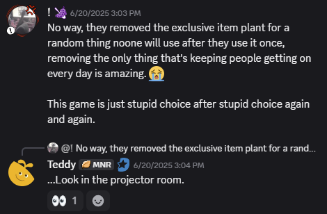 I managed the operation of the store between QA tasks, constructing the actual storefront using our UGC tools, selecting the items, creating the discounts, and, for the project's almost three month duration, I monitored public conversation about the store to drive hype among the community. Its success, was proved through the income and buzz it generated, challenging previous held assumptions about player-perceived value for consumable items, the importance of storefront visibility, and inspired a movement of changes throughout the revenue team to create sale experiences that were more dynamic and thrilling than we previously had. Shady Deals seemed to indicate to my lead that I should be allowed to work more design tasks. Though not the first time at Rec Room that I was able to weigh in on a design, this was very much my first break, and my first project as designer while working at the company.