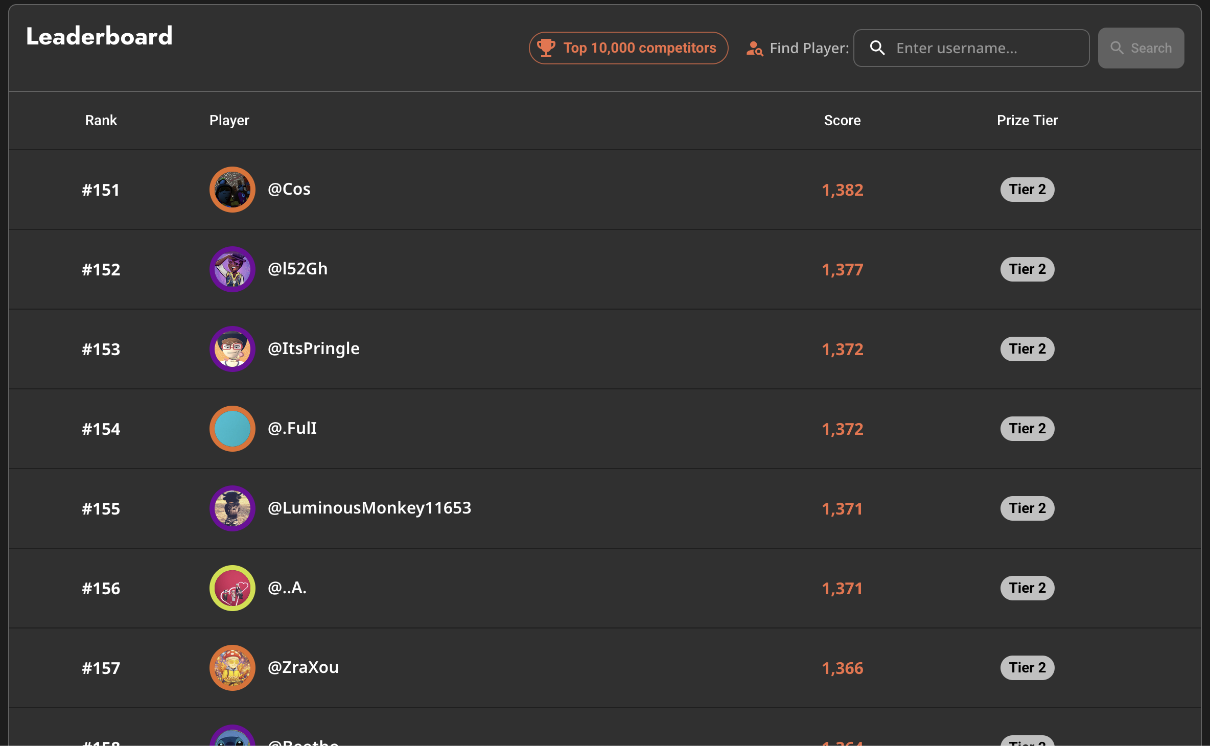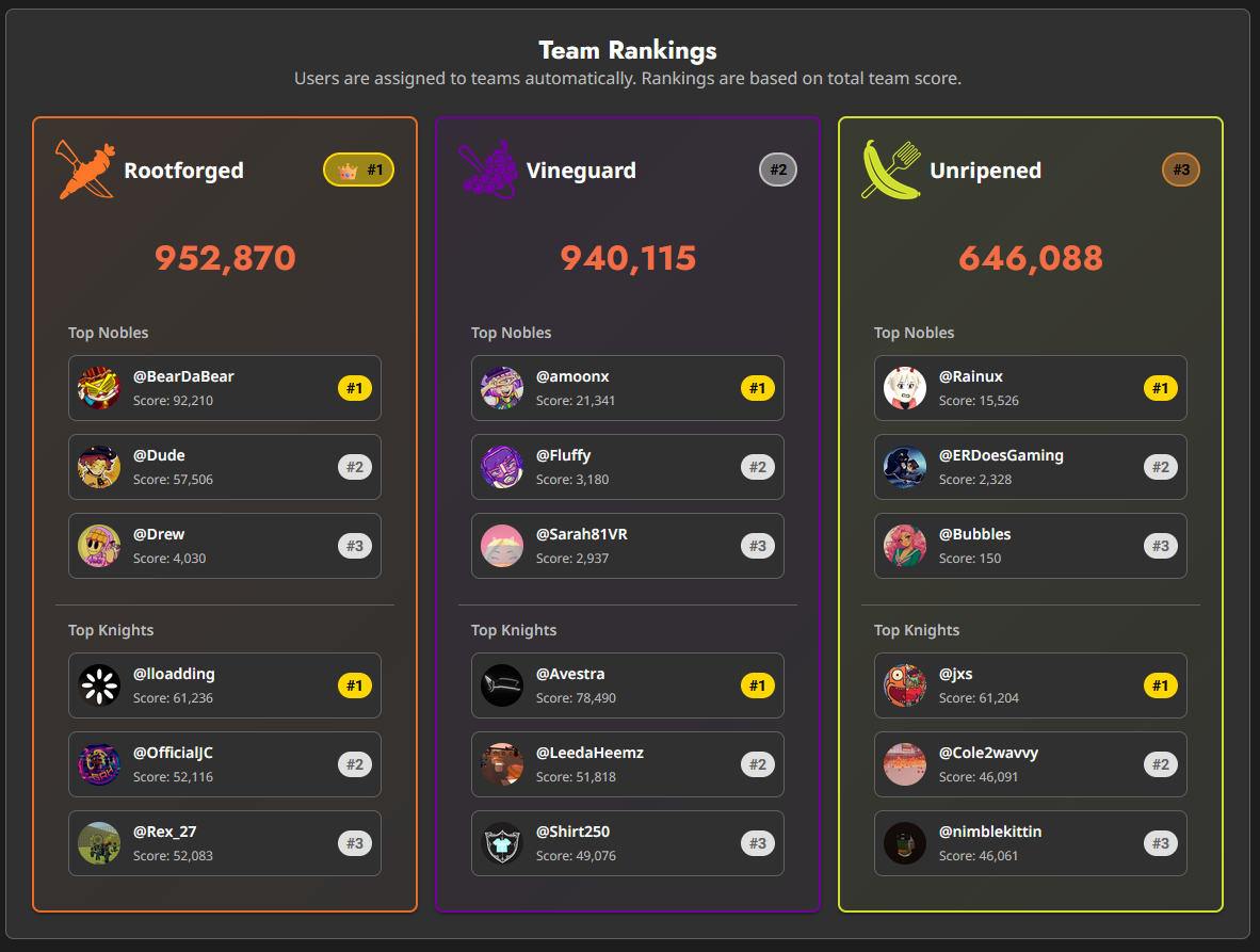 Exploding Glitch Grenades' single leaderboard format made it possible for us to create the conditions for a specific narrative and mechanical scenario that I wanted War of the Harvest Nobles to progress from. This event would be primarily a competition between three factions, which themselves were divided into two: a class of so-called Nobles comprised of our most influential content creators alongside our biggest spenders; and underneath them an army of conscripts, or Knights, made up of the rest of the population automatically sorted into one of the three factions.
