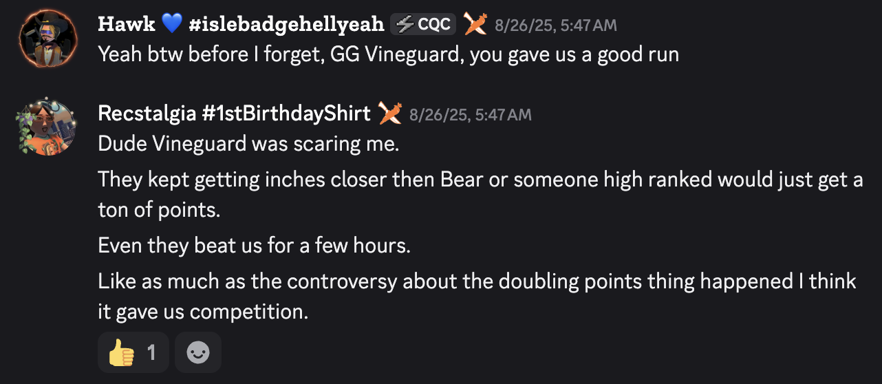 But the greatest trouble we ran into during the competition was to do with a performance misbalance, created by either one overperforming faction, the Rootforged, or an underperforming one, the Unripened. A mistake which must have contributed to this error originates weeks earlier when we first informed our Noble players about the event. Though it was never my intention to allow them to request assignment to particular factions, an internal miscommunication between myself and a colleague of mine who handled this outreach lead to a situation where the most active of our Nobles were heavily localized on the Rootforged. The plan always had been to balance against one faction outperforming all others; and though the Vineguard ended up neck and neck with the Rootforged in the end, I think this contributed to the disappointing performance of the Unripened faction. They were simply destitute of active and participating Noble players. So it was, just as with Glitch Grenades, but in a microcosmic and contained segment of the competition's participants, that some players were faced with a much greater challenge if they wanted to be competitive.