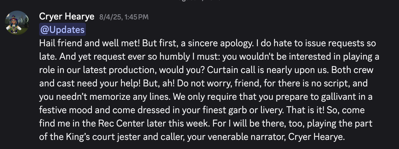 Cryer Hearye debuted herself to our community on a Monday with an unexpected first post, energizing our players with references to the established Theatre Department narrative conceit, inviting them to participate in an upcoming production.