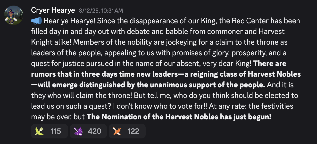 Nomination of the Harvest Nobles presented players with the drama of an election, inviting them to ally themselves with a particular faction by nominating a Noble house as governing leaders; but this was just smoke and mirrors. Behind the scenes, the three factions were already populated. Our Noble players had been informed that something like this was coming. Those who saw it mutually beneficial to drive hype for the event and their role within it ended up creating plenty of fun content during the three days the fake election ran.
