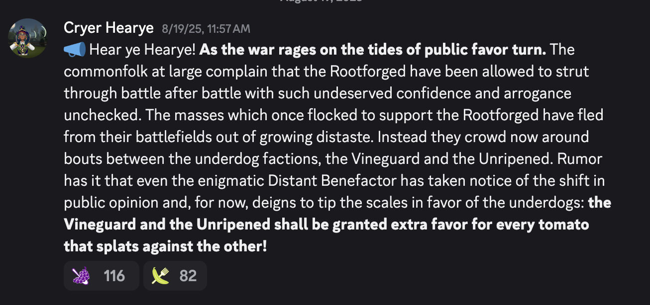 One way we attempted to respond in this kind of spirit involved offering two factions a multiplier to points earned from successful hits with tomatoes for a small period of time. The Unripened had been falling further and further behind both the Vineguard and the Rootforged for several days when we decided to attempt this. As previously mentioned, the Rootforged Nobles were, in addition to being wealthy and influential, quite coordinated (watch the rather funny "I Broke Rec Room's Biggest Event..." by overall winner and Rootforged Noble, BearDaBear, for a clearer picture). Counterbalancing this with an arbitrary advantage would, I worried, prove controversial and lead to an upset. But it seemed unlikely that even with a point multiplier applied the Unripened would be able to overtake either of their opponents. And there were still plenty of days to the competition left. I hoped any negative feelings spurred by the multiplier would be offset by the drama its announcement might create, invigorating the meager Unripened to strive for success, stealing the spotlight from the Rootforged and setting a fire underneath them.
