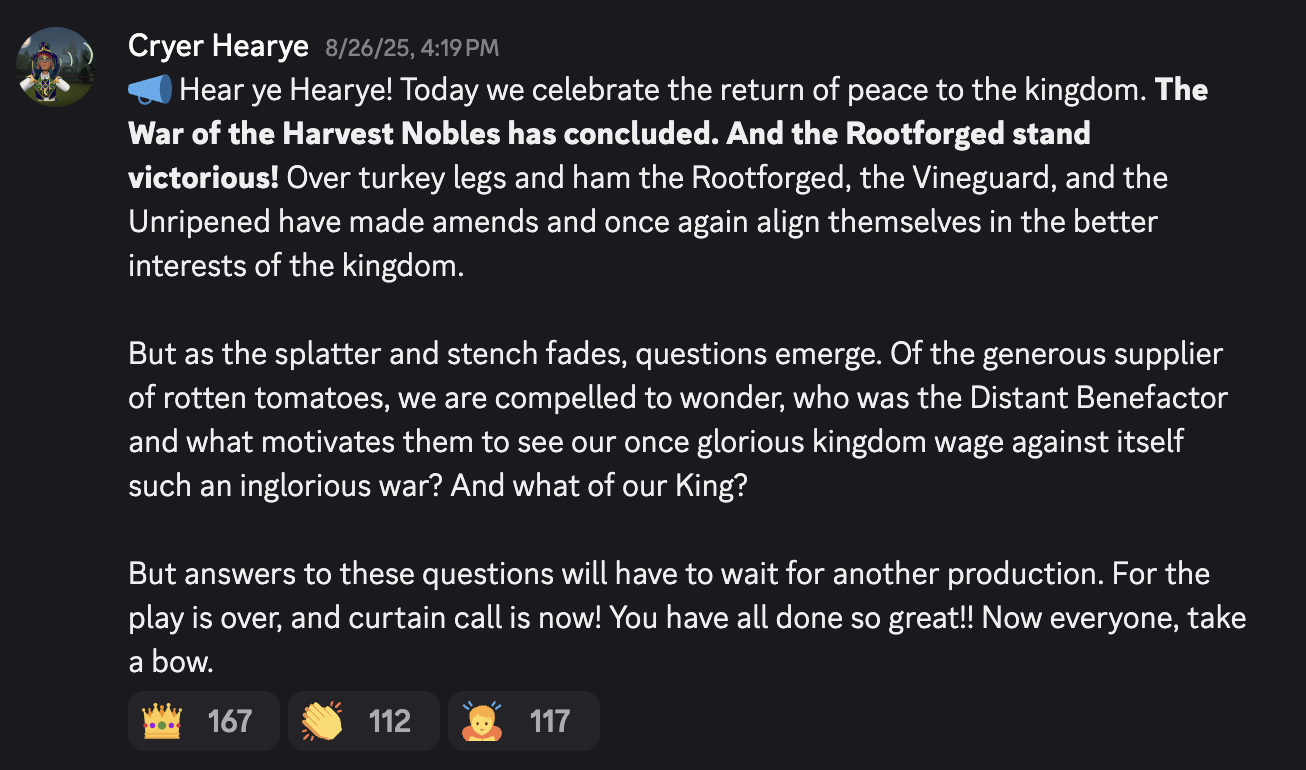 All the work we put into orchestrating a scenario that would play out in a novel, inclusive, and fun way paid off with increased revenue and excited praise by the community. I was told by a former colleague of mine, my producer, Aaron, with a few days of the competition left, that the event had sustained an average daily revenue increase of 6% and courted the participation of more than 16% of our daily active users. That's great news for the business. But to have my design and writing lead to something so exciting and lively was immensely affirming. The drama of the competition, the suspense it created, and the playful creativity on display in the videos and rooms and banter told me that the vision I had so confidently advocated for, and was given a chance and a team to actualize, had actually made sense to our players. I found a great source of validation as well every time I would hear a player say something to the effect that, in a year where Rec Room had done so much to alienate trust with inane LLM projects and baldly pay-to-win events, War of the Harvest Nobles was an event they could feel happy participating with.